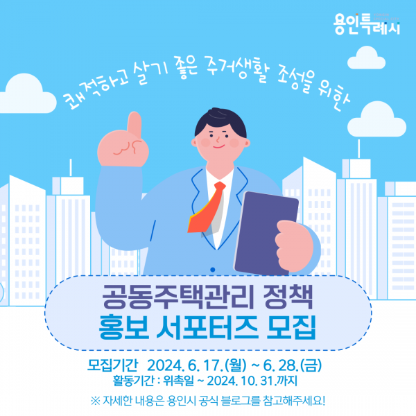 [금요저널] 용인특례시는 공동주택 관리 정책의 홍보와 주민 참여를 확대하기 위해 ‘공동주택관리 정책 홍보 서포터즈’를 모집한다고 18일 밝혔다.