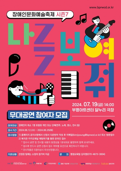 [금요저널] 부평구 부평장애인종합복지관은 오는 7월 19일 부평아트센터 달누리 극장에서 열리는 2024 장애인문화예술축제 ‘나를 보여줘 시즌7’ 공연 참가자를 모집한다.