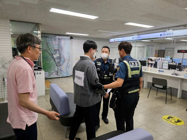 실제 민원 응대 중 빈번히 발생하는 상황을 가정해 △민원인 폭언과 폭행 발생 △비상벨 호출을 통한 경찰 긴급출동 요청 △피해 공무원 보호 및 방문 민원인 대피 △악성 민원인 제압 △경찰 인계 후 상황 종료 순으로 진행했다.