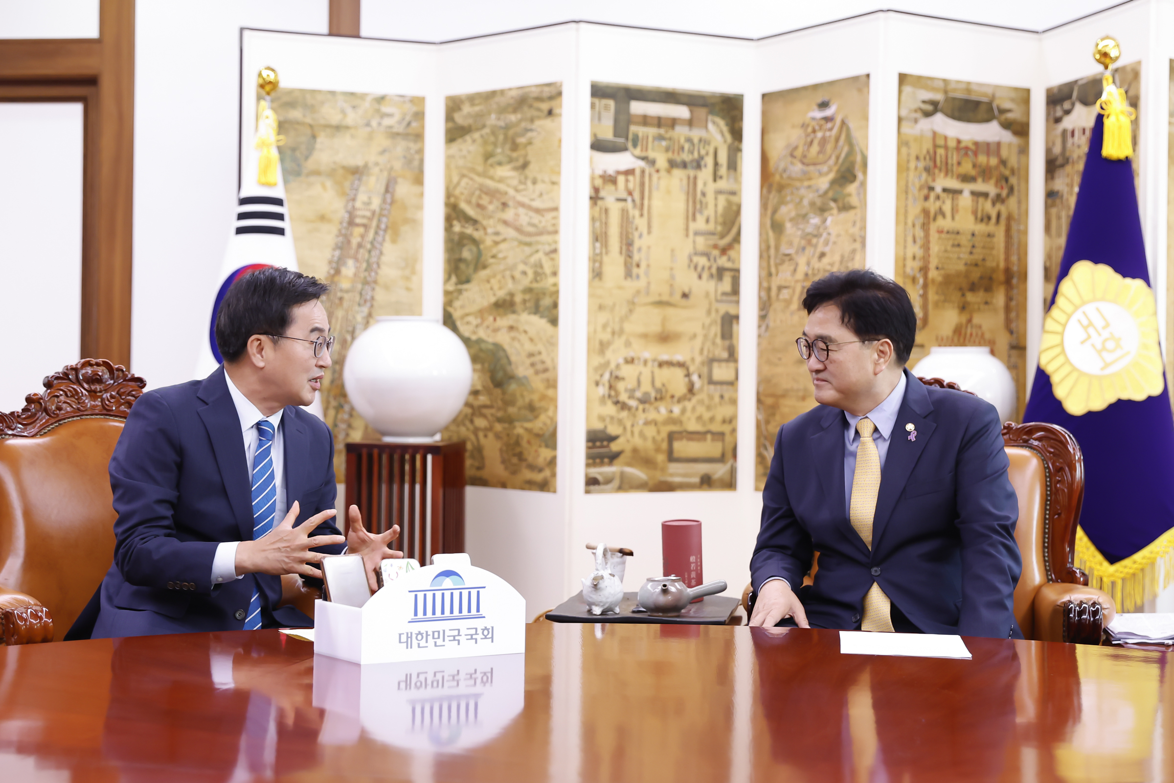 김동연 경기도지사가 우원식 국회의장을 만나 ▲반도체 특별법 제정 ▲RE100 3법 제·개정 ▲경기북부특별자치도 설치 특별법 제정 등 경기도 주요 입법과제인 ‘경제 3법’에 힘을 모아달라고 요청했다. 두 사람은 특히 공동의 관심사인 기후위기 대응을 놓고 의견을 나누며 함께 노력하겠다는 의사를 밝혔다.