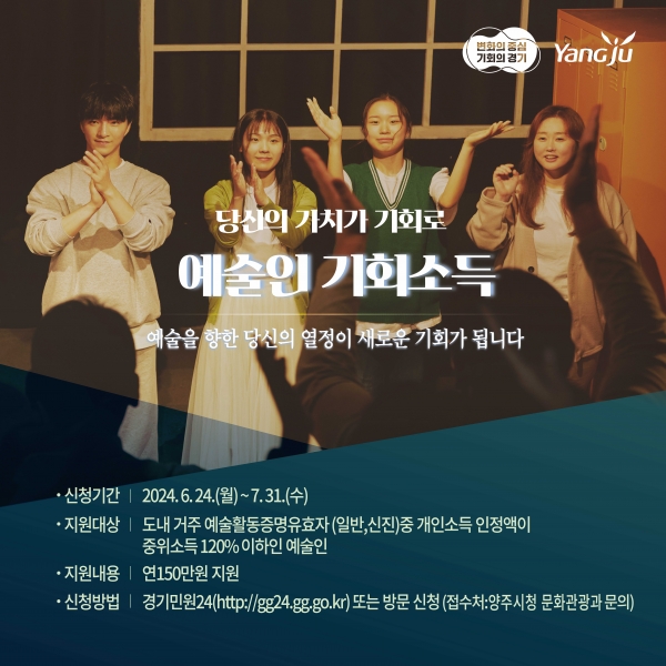[금요저널] 양주시는 오는 24일부터 7월 31일까지 ‘경기도 예술인 기회소득’ 사업의 신청을 받는다고 밝혔다.