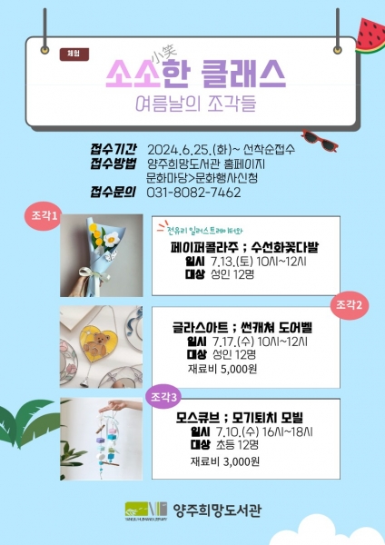 [금요저널] 양주시가 오는 25일부터 양주희망도서관에서 ‘여름날의 조각들’이라는 주제로 체험 행사인 ‘소소한 클래스’의 참여자를 선착순 모집한다고 밝혔다.