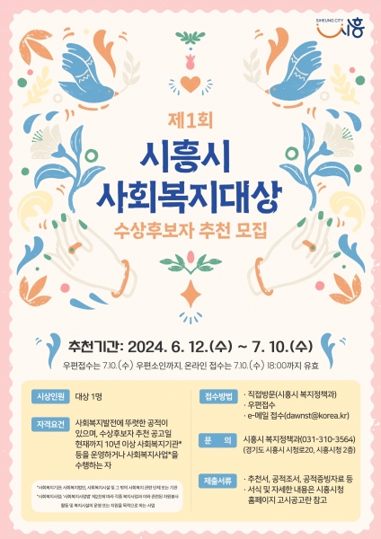 유재홍 시흥시 복지국장은 “다양한 사회복지 분야에서 두각을 나타낸 시민들의 공로를 인정하고 그들의 노력과 기여를 널리 알릴 수 있도록 관심과 추천을 부탁드린다”고 말했다.