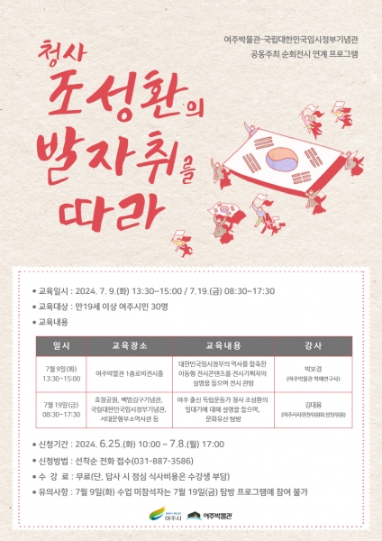 이번 프로그램은 여주박물관과 국립대한민국임시정부기념관의 공동순회 전시 “기억상자”와 연계해, 대한민국임시정부 군무부장으로 광복군 창설을 주도한 여주 출신 독립운동가 청사 조성환과 관련된 국내 문화유산을 탐방할 예정이다.