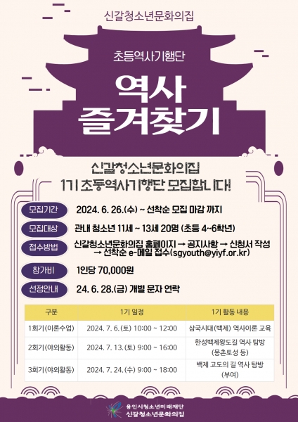 [금요저널] 재단법인용인시청소년미래재단 신갈청소년문화의집은 역사의식 함양 및 중요성을 알리고자 초등역사기행단 ‘역사 즐겨찾기’ 1기 프로그램 참가자를 모집한다고 25일 밝혔다.