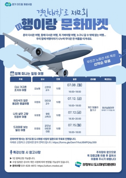 [금요저널] 의정부시 도시재생지원센터는 7월 8일부터 15일까지 경기도형 도시재생사업의 일환으로 경민대학로 청년실험마켓에서 ‘제2회 문화마켓 특강’을 진행한다.