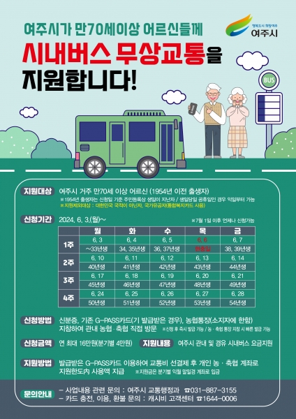 [금요저널] 경기 여주시는 70세 이상 어르신들을 대상으로 하는 시내버스 무상교통 지원사업을 오는 7월 1일부터 본격 시행한다고 전했다.