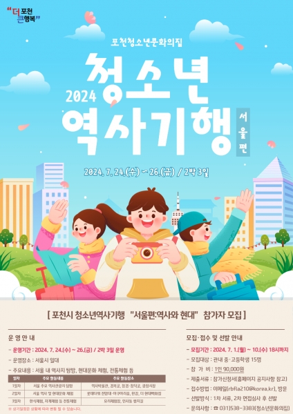 [금요저널] 포천청소년문화의집은 오는 7월 24일부터 26일까지 서울시 일대에서 진행되는 역사 탐방 프로그램 ‘청소년 역사기행 [서울편:역사와 현대]’의 참가자를 모집한다.