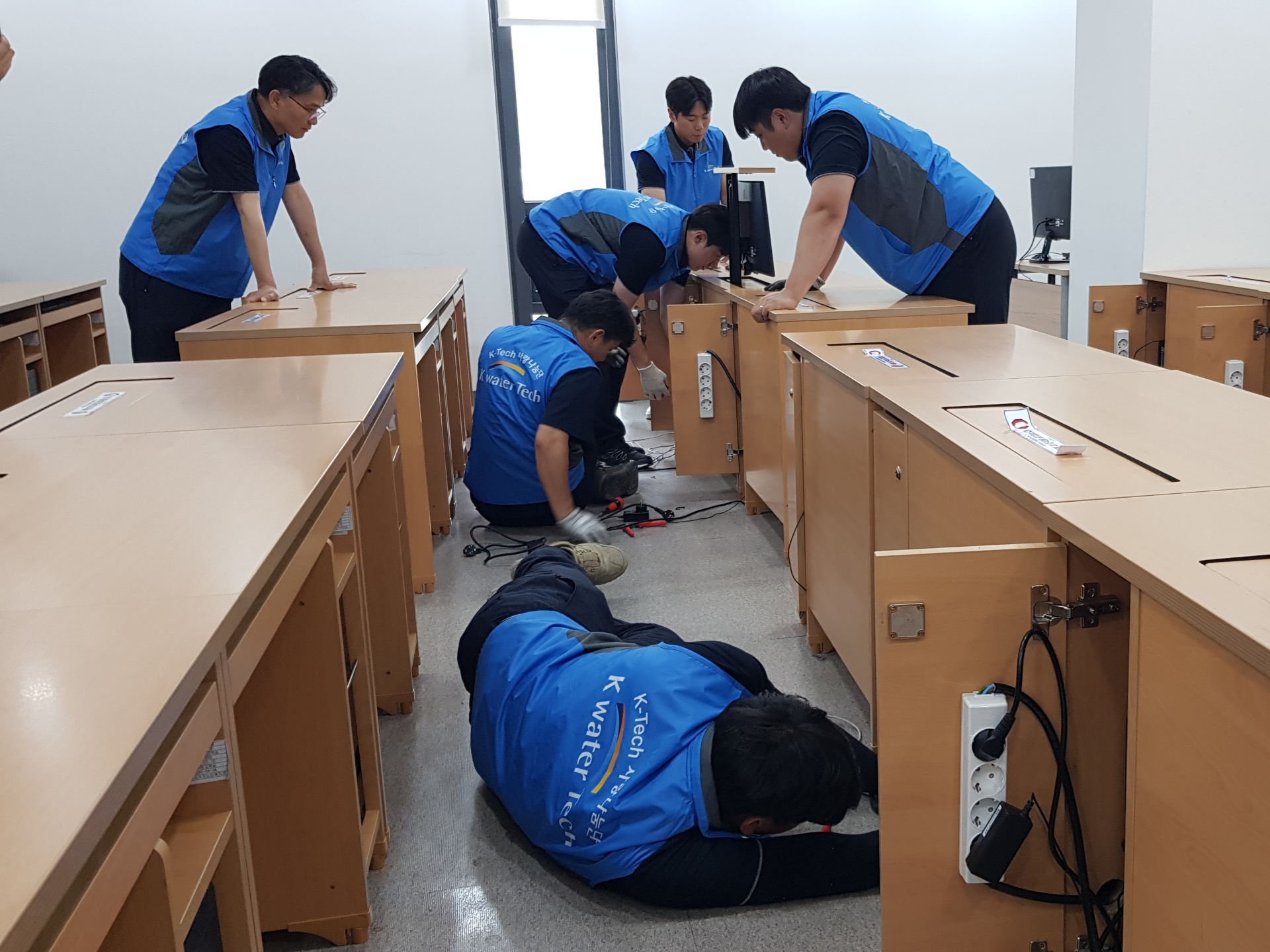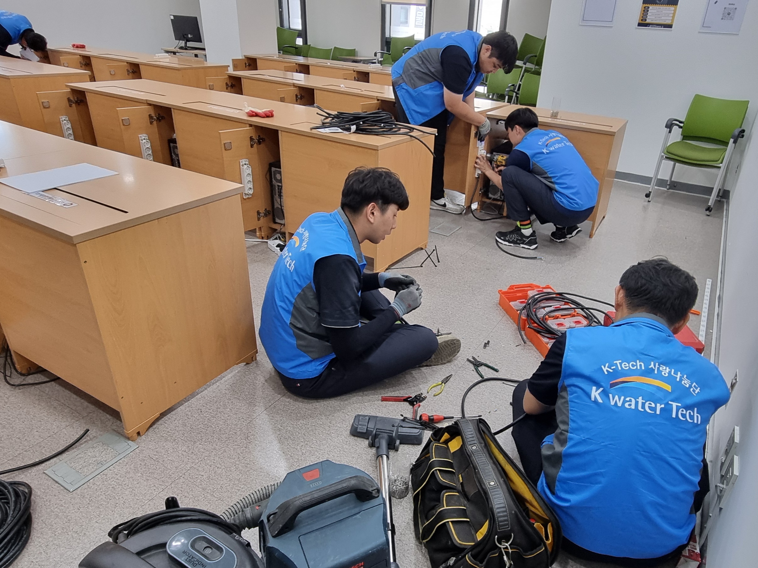 케이워터기술(K-water Tech) 사랑나눔단은 노인교육 공간의 불편 사항 개선을 위하여 복지관 정보화실 내 복잡한 전기배선과 인터넷선 개선작업을 실시하였다.