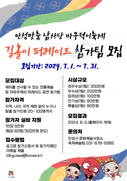 [금요저널] 안성시는 안성맞춤 남사당 바우덕이축제 길놀이 퍼레이드 15개의 참가팀을 7월 1일부터 31일까지 모집한다고 밝혔다.
