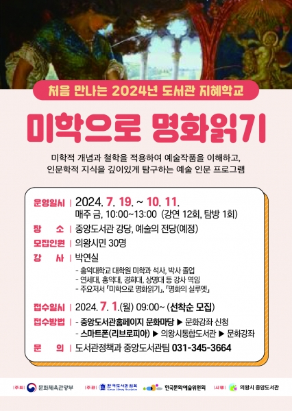 의왕시 중앙도서관은 예술 프로그램 개설에 대한 지역 수요를 반영해 ‘미학으로 명화읽기’를 주제로 7월 19일부터 10월 11일까지 13주간 매주 금요일에 도서관 지혜학교를 운영한다.