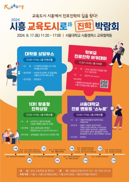 [금요저널] 시흥시는 시흥진로체험지원센터, 시흥시인재양성재단, 시흥교육지원청과 공동 주최로 8월 17일 11시 20분부터 오후 5시까지 서울대학교 시흥캠퍼스 교육협력동에서 ‘2024년 시흥 교육도시로 진학 박람회’를 개최한다.