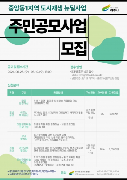 사업신청은 6월 26일부터 7월 10일까지 관련 서류를 여주시 도시재생지원센터에 방문 제출하거나 이메일 접수하면 되며 선정모임은 8월초 공지될 예정이다.