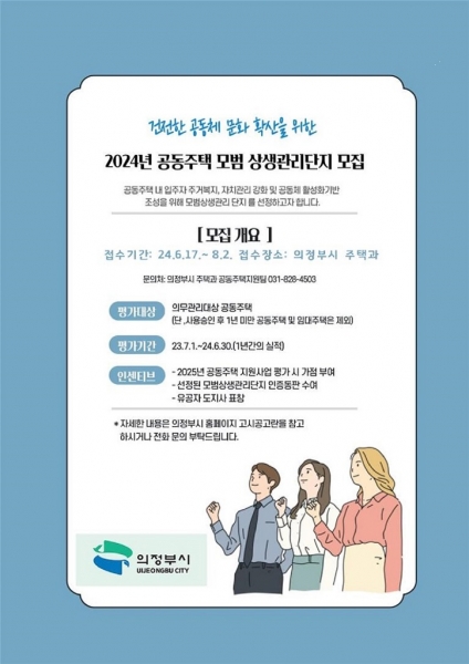 [금요저널] 의정부시는 경기도가 시행하는 ‘2024년 공동주택 모범·상생관리단지’ 및 ‘착한아파트’를 선정하기 위해 8월 2일까지 참여 신청을 받는다.