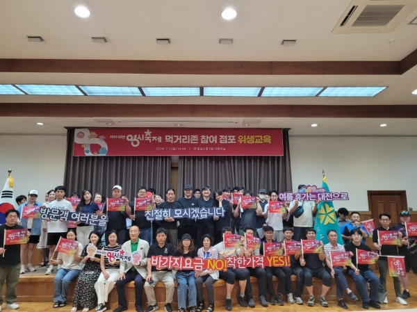 [금요저널] 대전시는 8월 개최되는 ‘대전 0시 축제’를 찾는 방문객에게 안전한 먹거리를 제공하고 바가지요금 근절 및 친절한 손님맞이를 위해 1일 먹거리존 참여 점포들을 대상으로 위생교육을 시행했다.