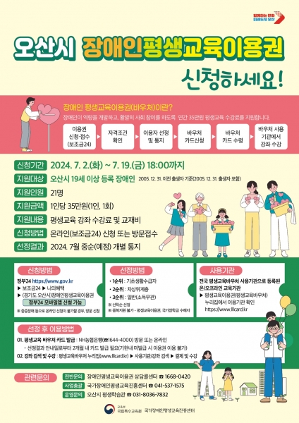 [금요저널] 오산시는 관내 등록장애인을 대상으로 ‘2024년 장애인 평생교육이용권 지원사업’을 시행한다.