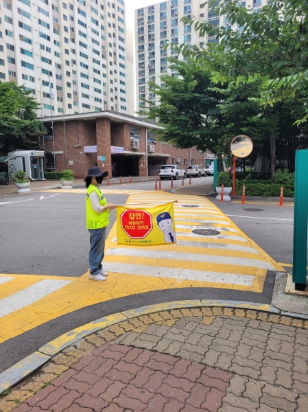 안전지도 활동가는 매일 오후 1시부터 3시까지 차량 통행이 빈번한 학교 후문 건널목 횡단보도를 아동들이 안전하게 건널 수 있게 지도하고 있다.