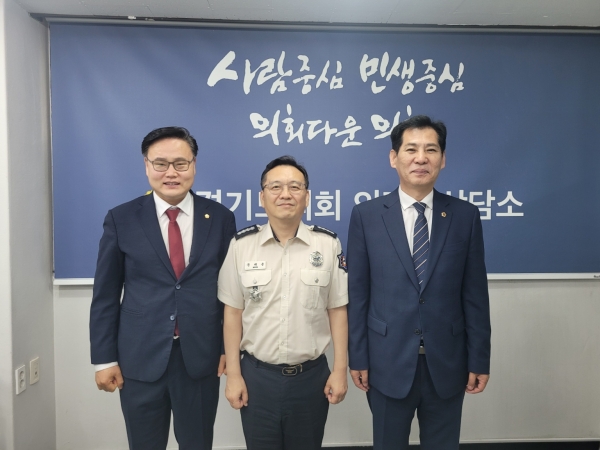 [금요저널] 경기도의회 김정영, 이영봉 도의원은 지난 2일 도의회 의정부상담소에서 최근 새로 부임한 제29대 문태웅 의정부소방서장의 취임 인사차 방문과 동석한 박경식 소방행정팀장을 접견하고 환담을 나누는 시간을 가졌다.