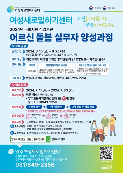 수강을 희망하는 시민은 구직신청서와 참가신청서 요양보호사자격증 사본, 반명함 사진 1매를 지참해 양주고용복지플러스센터 1층 양주여성새로일하기센터로 방문 신청하면 된다.