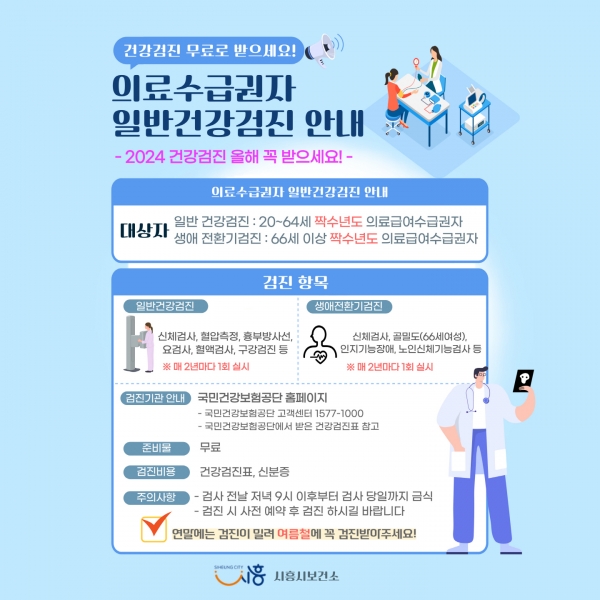 시흥시 보건정책과장은 “건강한 삶을 위한 작은 실천인 건강검진을 통해 질병을 예방하고 질환을 조기 발견해 건강한 삶을 누리길 바란다 검진을 연말로 미루지 말고 이른 시일 내에 받길 당부드린다”고 말했다.