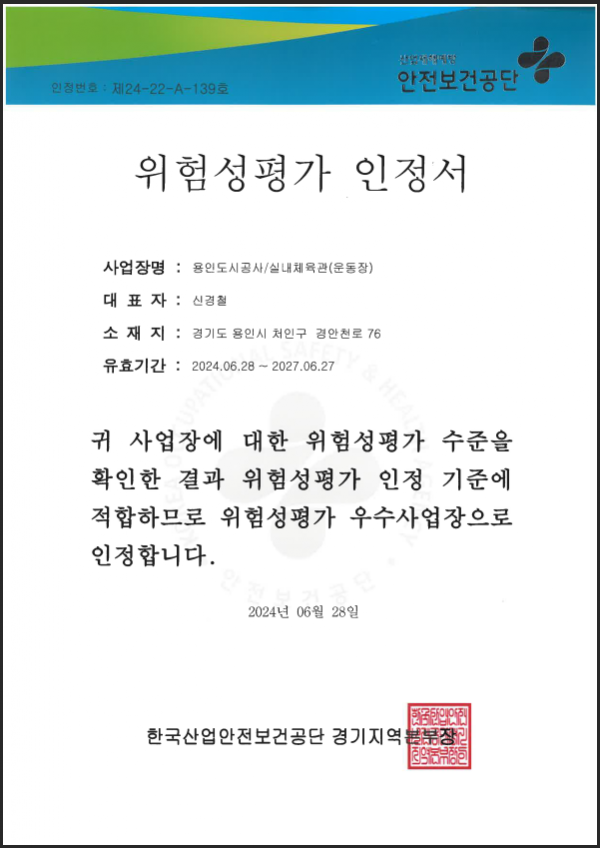지난 2021년 6월 28일 용인실내체육관은 위험성평가 우수사업장으로 최초 인정받았다.
