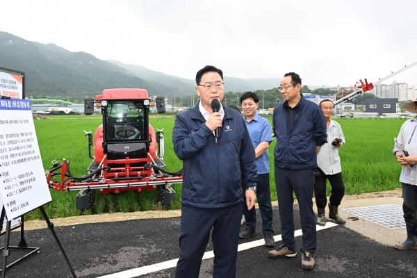 [금요저널] 강수현 양주시장은 9일 오전 관내 삼숭동 벼 재배 포장에서 개최한 ‘붐스프레이어 활용 벼 약제 살포 연시회’ 현장을 방문해 농가와 관계인들의 노고를 격려했다.