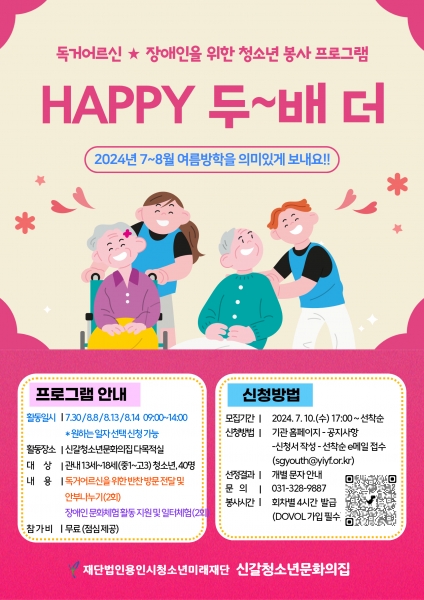 관내 13세~18세 청소년 10명을 모집해 실시하는 ‘Happy 두~배 더’ 프로그램은 기흥구 소재 독거 어르신 10가정을 직접 방문해 반찬을 전해드리고 안부를 나누는 활동과 기흥직업지원센터에서 일하시는 장애인들의 문화 체험 활동을 지원하는 봉사활동으로 진행될 예정이다.