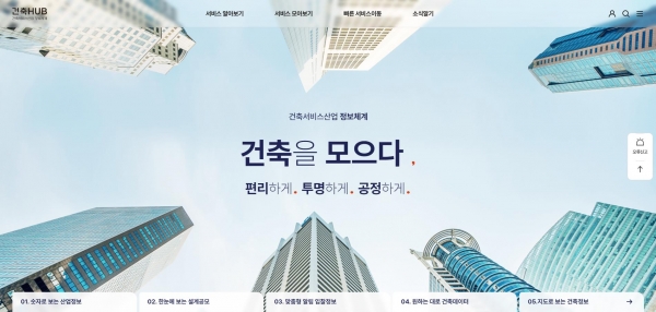 이 서비스는 건축 서비스산업 통합정보 플랫폼인 ‘건축 HUB 건축 HUB: 건축 서비스산업 진흥법 제8조에 따라 구축된 정보체계로 건축 서비스산업 현황정보, 수주실적, 입찰 정보 등을 제공하고 있다.