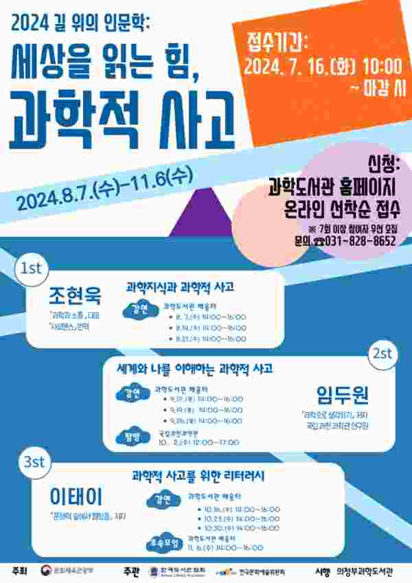 의정부과학도서관은 8월 7일부터 11월까지 세상을 이해하고 문제를 해결하는 데 필수적 도구인 과학적 사고의 개념과 중요성, 과학적 사고가 삶에 미치는 영향, 과학적 사고를 위한 리터러시 등의 내용을 강연 9회, 탐방 1회, 후속모임 1회로 구성해 제공한다.