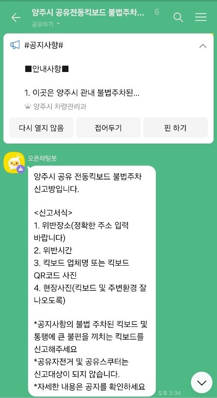이번에 불법주차 된 공유전동킥보드 처리와 관련해 오픈채팅방을 운영함으로써 쉽고 빠른 처리가 가능하게 될 예정이다.