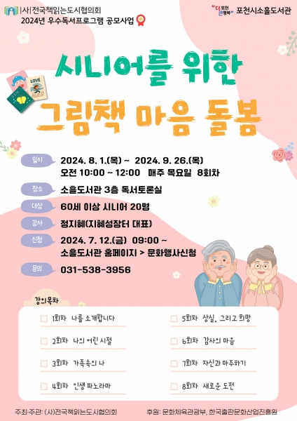 [금요저널] 포천시는 전국책읽는도시협의회가 주최하는 ‘2024년 우수독서프로그램’ 공모에 선정됨에 따라 오는 8월 1일부터 9월 26일까지 소흘도서관에서 ‘시니어를 위한 그림책 마음 돌봄’ 프로그램을 운영한다.