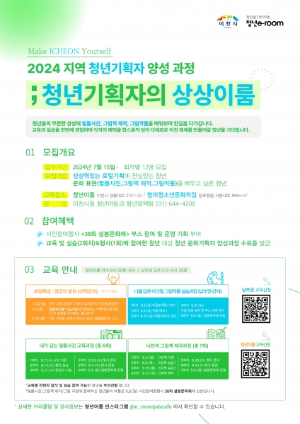 △로컬특강 △필름사진반 △그램책 제작반 △아크릴 그림작품 실습반으로 구성해 지역의 특색을 담은 문화기획 이론과 실무 전반을 다루는 본 과정은 19세 이상 39세 이하 관내 청년이면 누구나 15일부터 QR코드를 통해 신청할 수 있다.