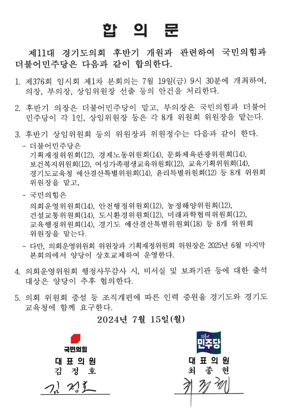 양당이 발표한 합의문에 따르면 후반기 의장은 더불어민주당이 맡고 부의장은 국민의힘과 더불어민주당이 각 1인, 상임위원장 등은 양당이 각각 8개 위원회를 맡는다.