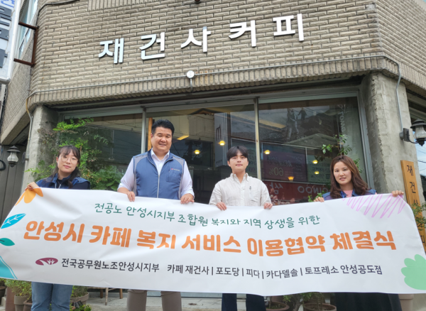 이날 협약은 전국공무원노동조합 안성시지부의 제안으로 이뤄졌으며 지역경제 활성화와 조합원의 복지증진을 위해 재건사커피, 카사델솔, 토프레소공도, 포도당, PIDA 등 지역 내 카페 5곳이 참여해 상호 교류와 협력을 약속했다.