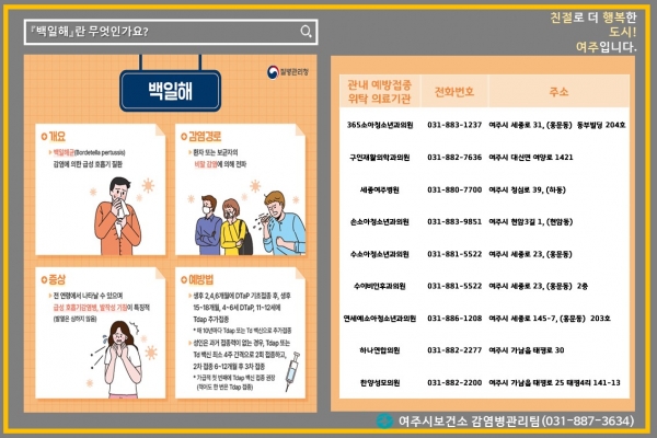 [금요저널] 여주시보건소 보건행정과는 최근 전국적으로 백일해 환자가 급증함에 따라 백일해 예방 접종 및 개인위생 준수를 당부했다.
