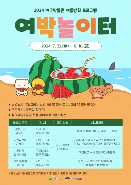 박물관 관계자에 따르면, “이번 여주박물관 여름방학 프로그램은 사전 예약 없이 현장 접수를 통해 참여할 수 있어 여주시를 우연히 방문한 관광객들에게도 좋은 추억을 선사함으로써 재방문으로 이어지기를 기대한다”고 전했다.