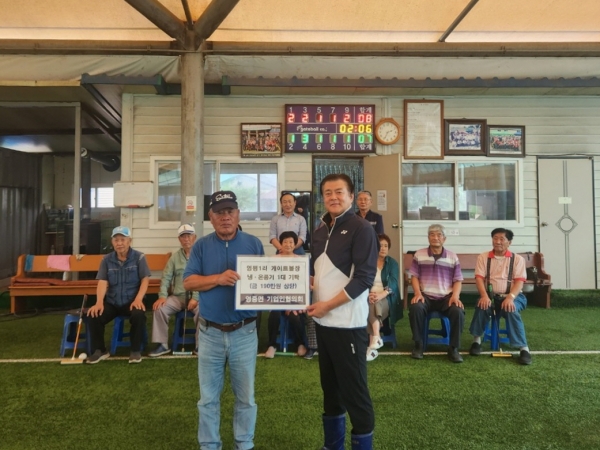 [금요저널] 포천시 영중면 기업인협의회는 지난 17일 영평1리 게이트볼장을 방문해 190만원 상당의 냉·온풍기 1대를 기탁했다.