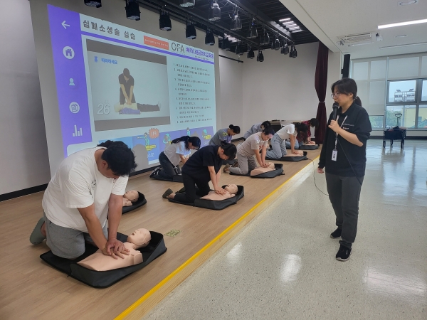 교육은 총 2시간으로 심정지 발생 시 신고 심폐소생술 방법, 자동심장충격기 원리와 적용 방법 및 심폐소생술 실습으로 이루어졌으며 추가적으로 자동심장충격기의 관리 방법 및 중요성 교육 또한 다루어졌다.