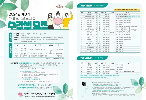 [금요저널] 양주시가 오는 8월 1일부터 16일까지 여성일·생활균형지원센터에서 ‘2024년 제3기 여성 교육프로그램’ 수강생을 선착순 모집한다고 밝혔다.