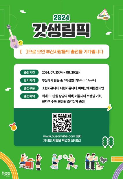 ‘2024 갓생림픽’은 부산에 가장 자부심이 될 커뮤니티를 ‘올림픽’ 종목처럼 예선과 본선을 통해 금, 은 동메달 수상자로 가리는 방식으로 진행된다.