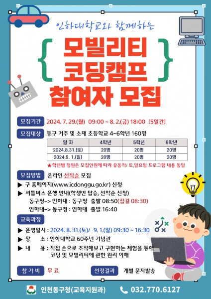[금요저널] 인천 동구는 8월 31일~9월 1일 인하대학교와 함께하는 ‘모빌리티 창의융합 코딩캠프’를 개최한다고 밝혔다.