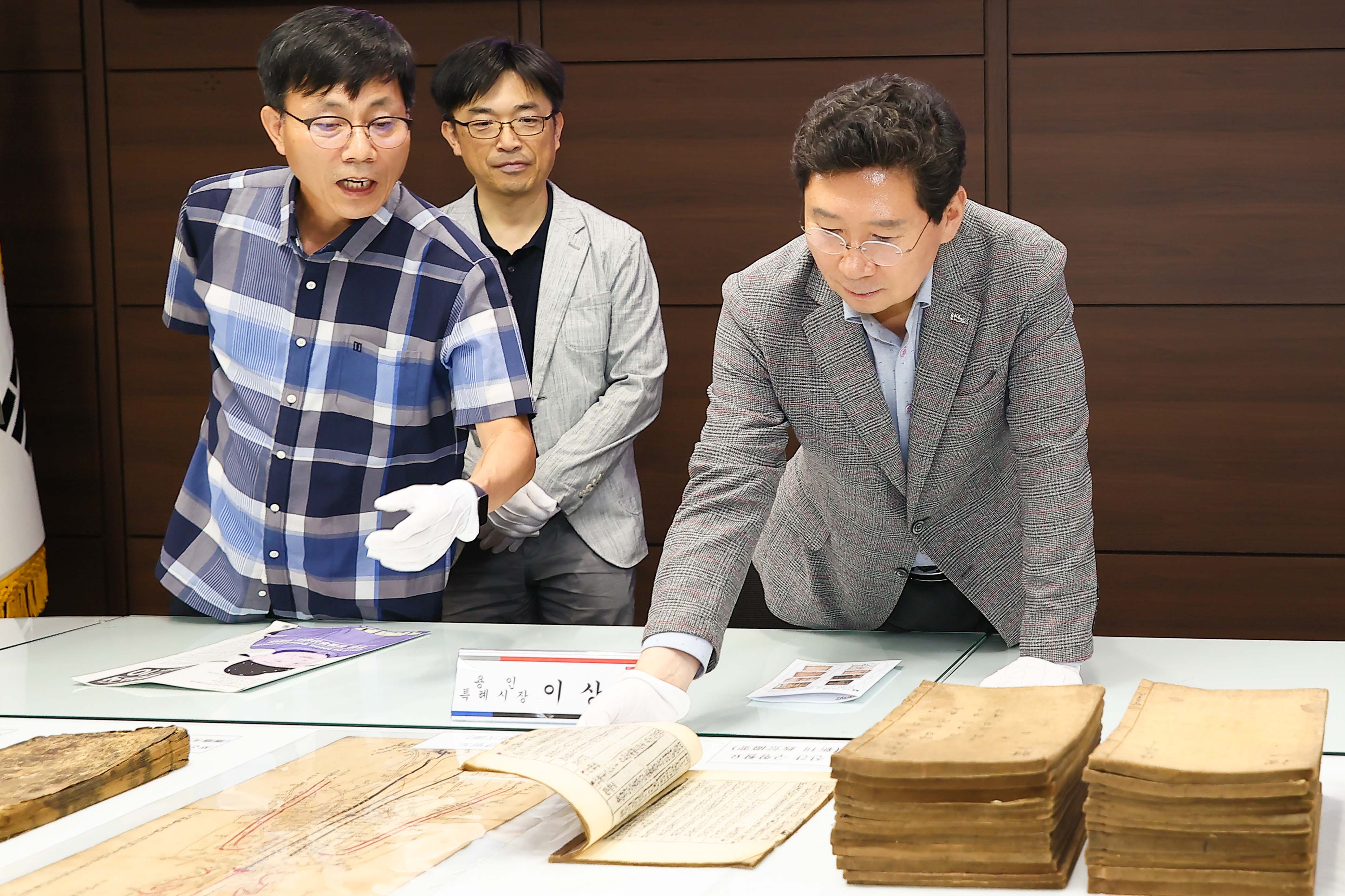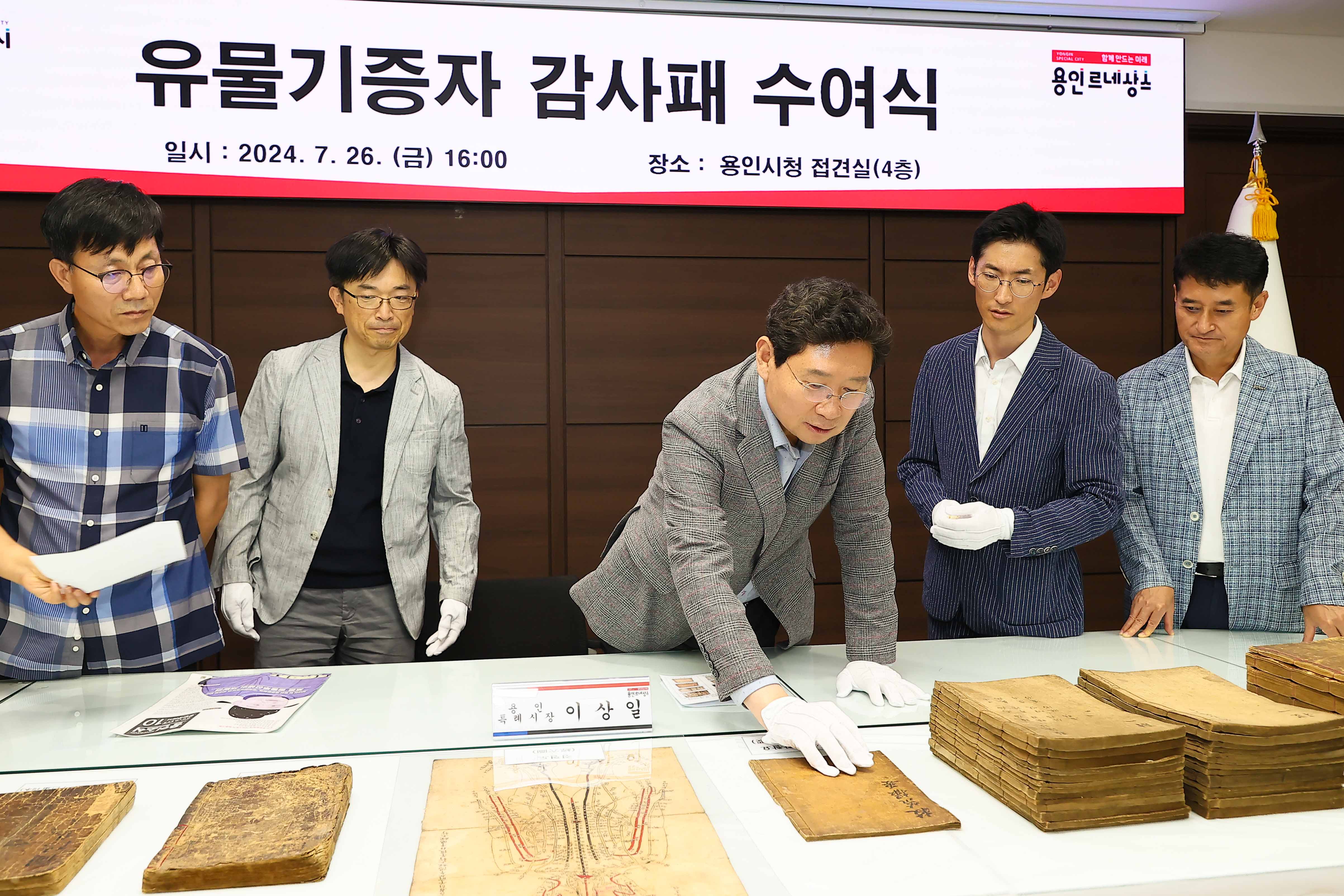용인특례시(시장 이상일)는 26일 시청에서 용인시박물관에 고문서와 자료 등의 유물을 기증한 최채기 씨와 남진우 씨에게 기증증서와 감사패를 수여했다.