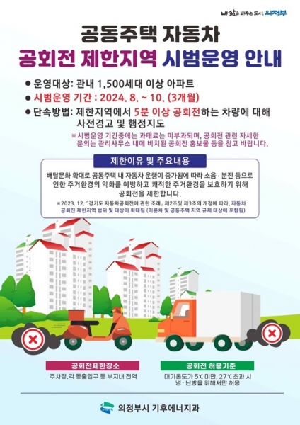 ‘경기도 자동차공회전 제한에 관한 조례’가 일부 개정돼 올해 7월 1일부터 이륜자동차와 공동주택 지역이 공회전 제한대상에 포함됐다.