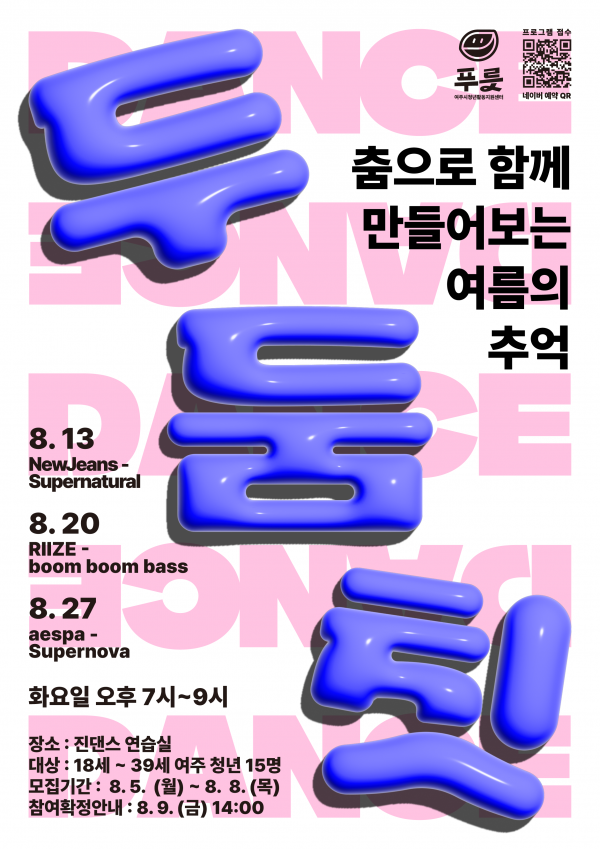 청년들 사이에서 큰 인기를 끌고 있는 숏폼 컨텐츠를 활용한 △릴스용 댄스배우기 △남자아이돌 댄스배우기 △여자아이돌 댄스배우기 등 여름을 맞아 청년들에게 인기가 많은 아이돌 그룹들의 댄스를 마스터 해볼 수 있는 시간으로 진행될 예정이다.