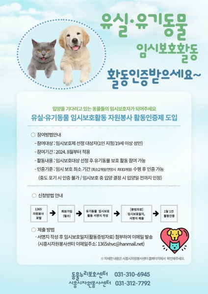 시흥시자원봉사센터는 늘어나는 유기 동물 문제를 해결하기 위해 유기 동물 임시 보호를 자원봉사 활동으로 인정하고 활동 인증을 부여하는 ‘시흥시 최초 동물 보호 활동 인증’을 8월부터 시행한다.