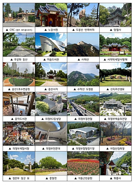 아울러 시는 이번 사업을 계기로 관내 관광명소 정립 차원에서 5월부터 시민들의 추천을 받아 △노강서원 △도봉산 반쪽바위 △망월사 △무궁화동산 △미술도서관 △사패산 △서계 박세당 사랑채 △송산1호 수변공원 △송산사지 △수락산 도정봉 △신숙주 선생 묘 △음악도서관 △의정부2동 성당 △의정부경전철 △의정부예술의전당 △의정부제일시장 △의정부천문대 △의정부컬링경기장 △자일산림욕장 △정문부 장군 묘 △중랑천 △직동근린공원 △회룡사 △캠프 레드클라우드 등 총 24개소의 명소를 정했다.