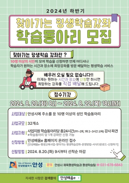 신청은 8월 20일 9시 부터 선착순 접수가능 하며 안성배움e 홈페이지에서 온라인 접수로 제출하면 된다.