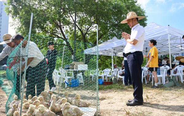 [금요저널] 의정부시는 8월 2일 장암동 광명교회 하부 중랑천에 조성된 벼농사 체험장에서 친환경 농법의 일환으로 오리를 방사했다.