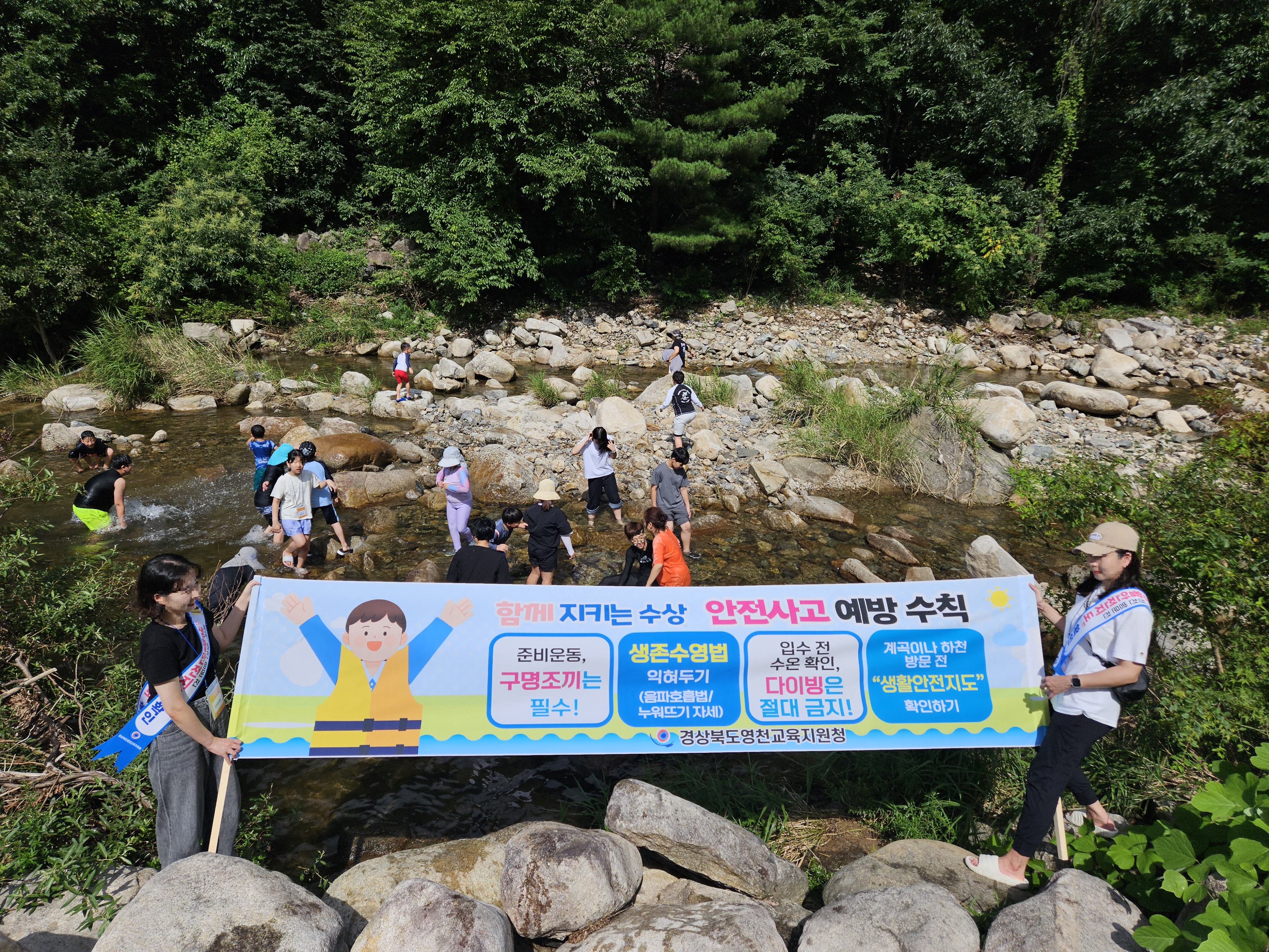 경상북도영천교육지원청(교육장 김희수)은 지난 27일 영천 치산관광지 일원에서 계곡 이용 학생 및 학부모를 대상으로 수상 안전사고 예방 캠페인을 실시하였다.