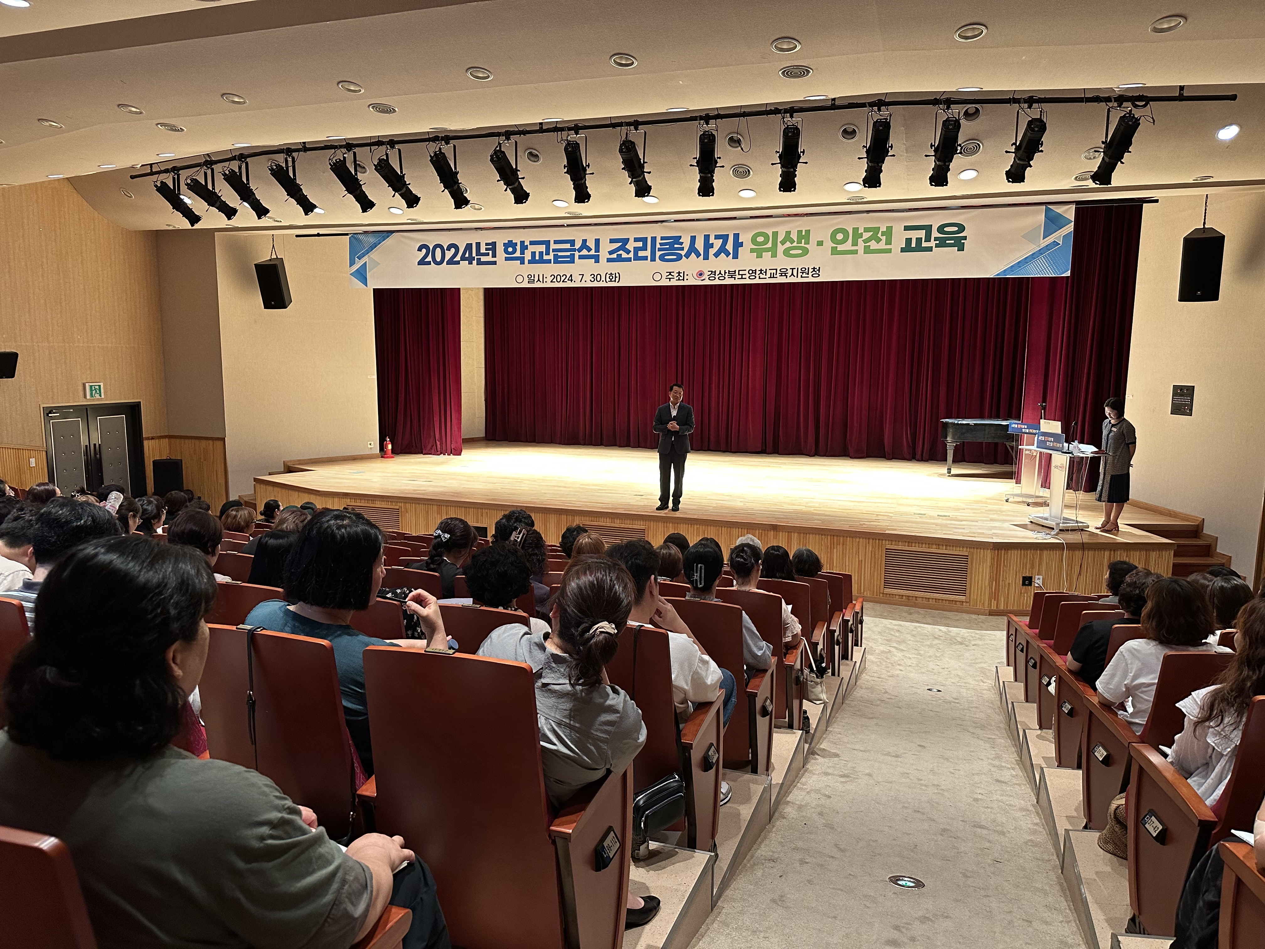 경상북도영천교육지원청(교육장 김희수)은 7월 30일(화) 영천시 청소년수련관 누리관에서 관내 관내 유·초·중·고·특수학교 및 각종학교 조리사, 조리원 140여명을 대상으로 위생·안전 연수를 실시했다.
